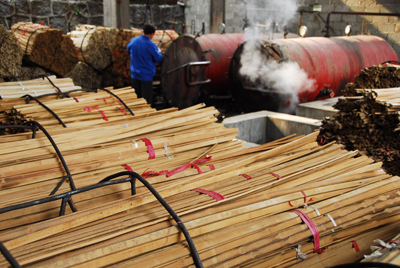 蒸煮碳化,將去掉竹片中的營(yíng)養(yǎng)成分,使得制造成的竹板材產(chǎn)品質(zhì)地更加緊密結(jié)實(shí),并且不防蟲防蛀。